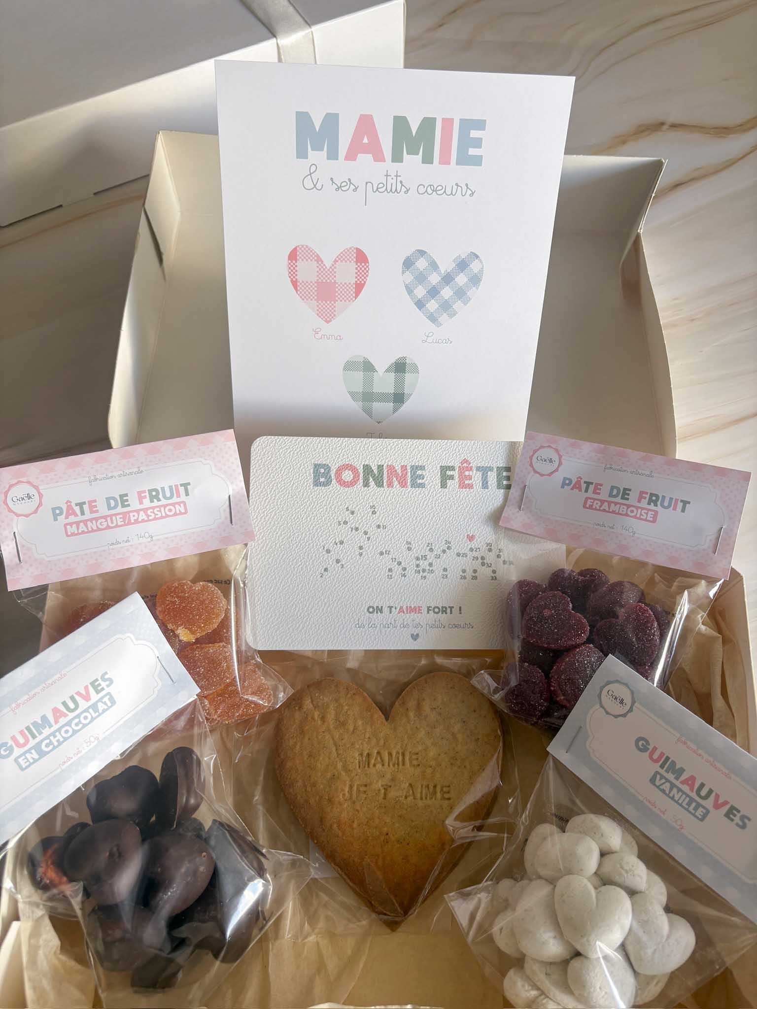 Un coffret personnalisé, imaginé spécialement pour elle : une affiche personnalisée avec les prénoms de ses petits-enfants, accompagnée de ses gourmandises favorites.